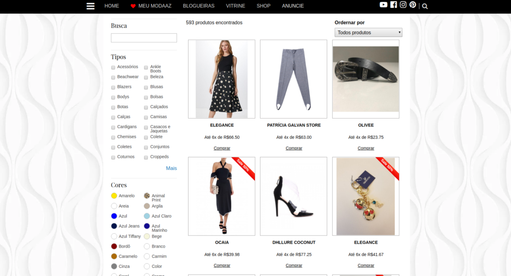 Na página Vitrine são listados todos produtos disponíveis na plataforma Modaaz. Nesta sessão é possível buscar os produtos por Nome, filtrar por Tipos, Cores, Marcas e Lojas. Além disso, de ordenar pelos Mais Vendidos, Novidades, Menor Preço, Maior Preço e Maiores Descontos.
